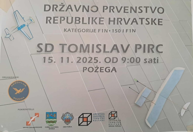 POŽEGA – U Sportskoj dvorani Tomislav Pirc, u subotu, 15. studenog 2025. od 9,00 do 17,00 sati održat će se državno prvenstvo zrakoplovnih modelara u kategorijama dvoranskih modela F1N-150 i F1N u organizaciji Aerokluba Požega.
