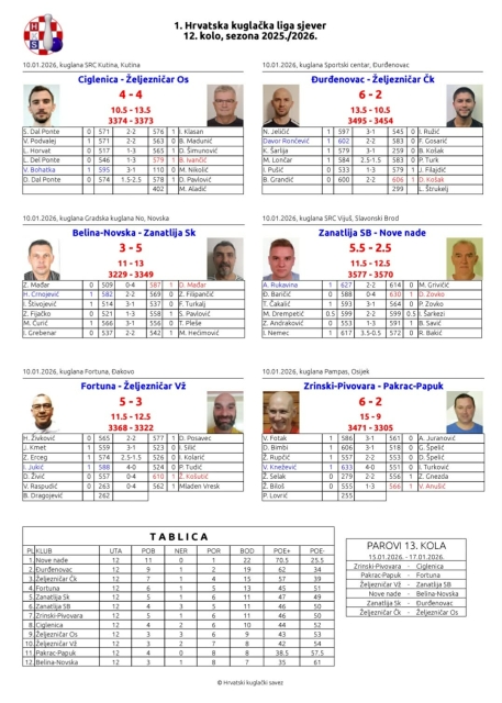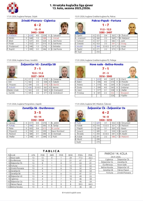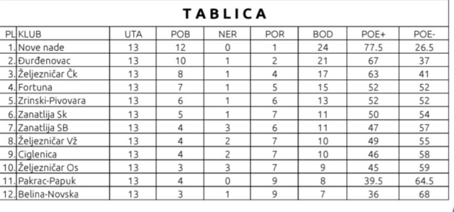 Nove nade su i dalje na prvom mjestu sa 12 pobjeda u 13 utakmica i osvojena 24 boda. Na drugom mjestu je Đurđenovac sa 21 bodom. U narednom, 14. kolu Požežani očekuje gostujući derbi upravo kod Đurđenovca (subota, 24. 01. 2026. u 14,00 sati). Pobjedom kod prvog pratitelja požeški klub bi bio nadomak ostvarenja svog glavnog cilja u ovoj sezoni, a to je naslov prvaka 1. HKL – Sjever i plasman u najviši državni rang – HEP Superligu.