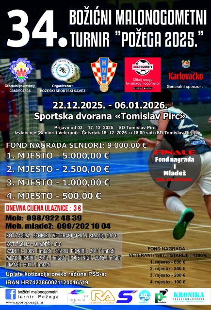 POŽEGA – U do kraja ispunjenoj Sportskoj dvorani Tomislav Pirc jučer je tijekom 12. natjecateljskog dana odigrana završnica u seniorskoj konkurenciji 34. Božićnog malonogometnog turnira “Požega 2025”.
