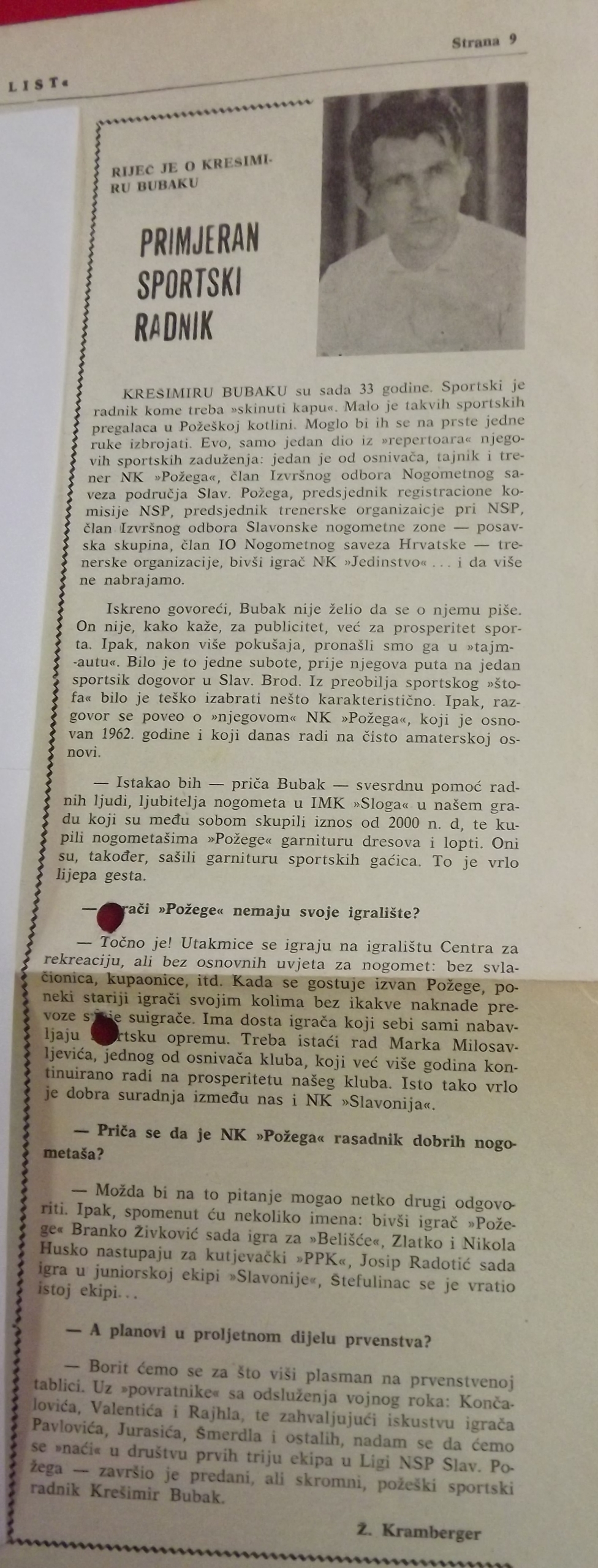 Krešimir Bubak rođen je 30. 08. 1942. u Požegi. Bio je dugogodišnji nogometaš, trener, tajnik, predsjednik i počasni predsjednik Nogometnog kluba Požega.