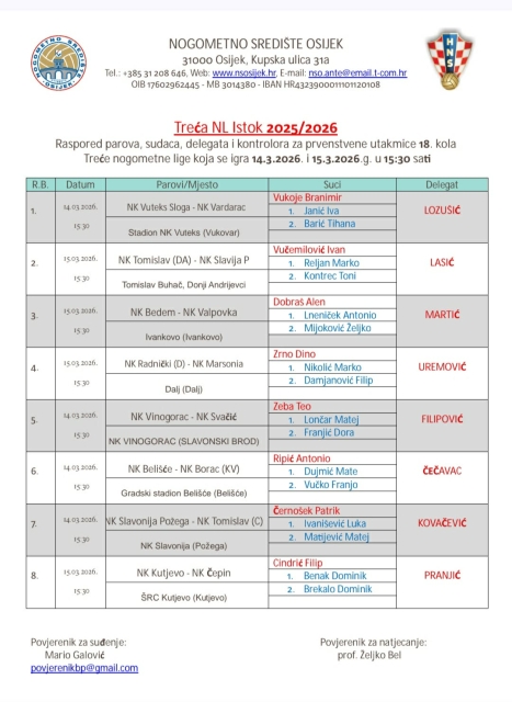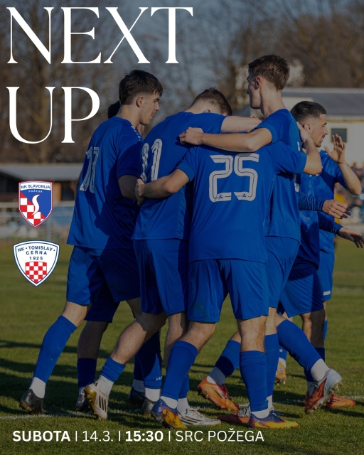 POŽEGA – Nogometaši Slavonije će svoj prvenstveni susret 18. kola 3. Nogometne lige – Istok protiv Tomislava (Cerna) odigrati u subotu, 14. ožujka 2026. s početkom u 15,30 sati na igralištu NK Požega na Sportsko – rekreacijskom centru.