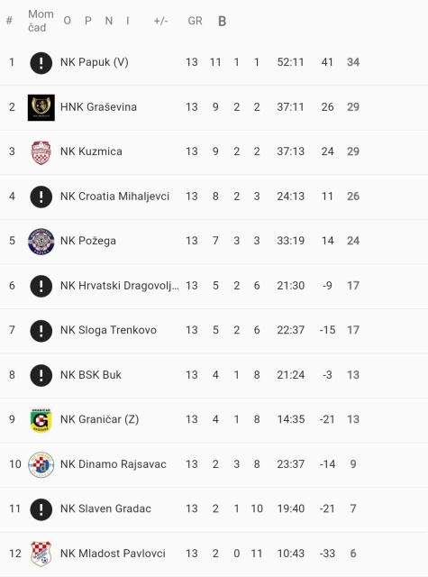 Ljestvica 1. ŽNL nakon 13. kola