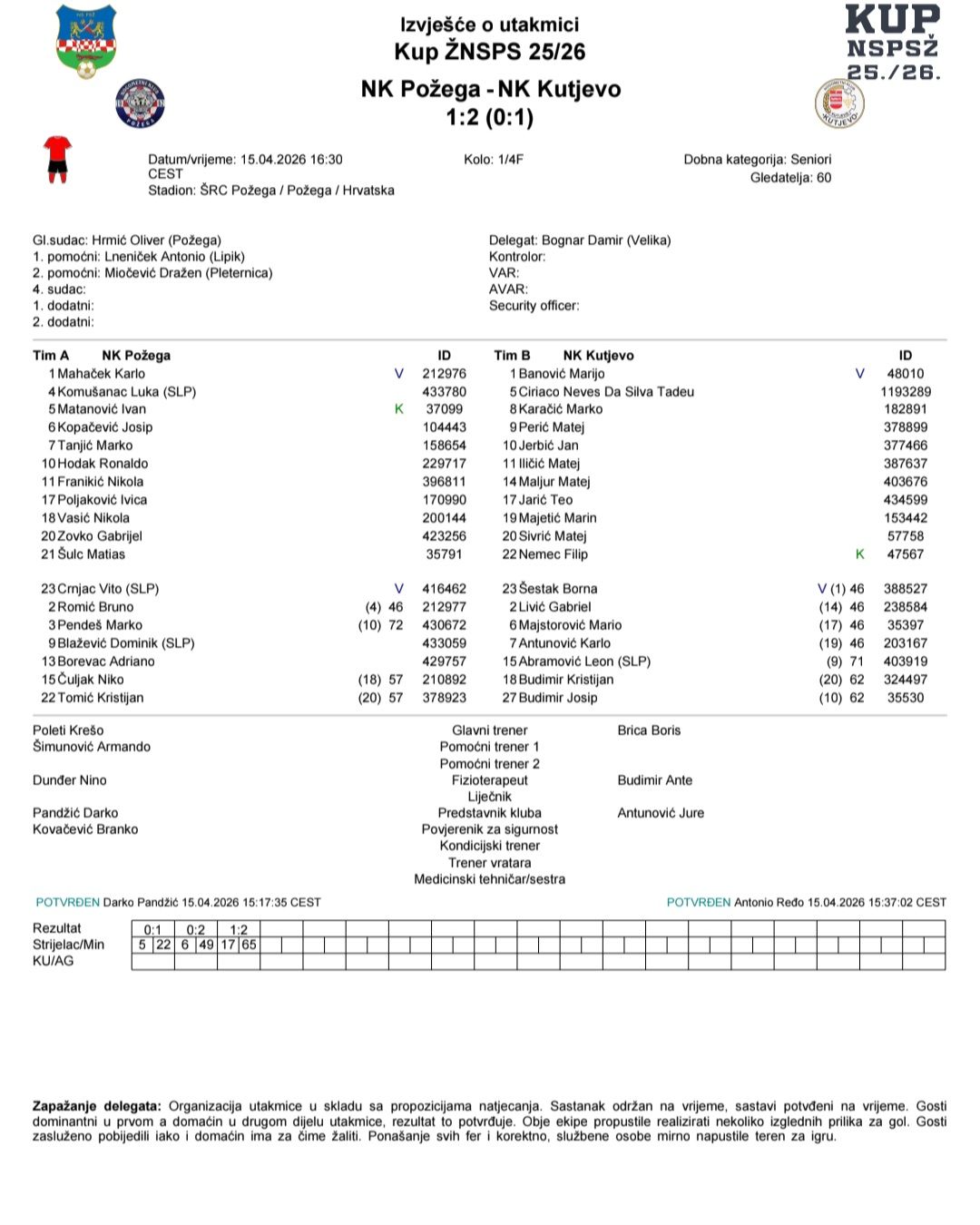 Iako ih dijele dva ranga natjecanja, Kutjevo nije imalo nimalo lak posao na Stadionu Krešimira Bubaka u Požegi. Zeleni su bili bolji u prvom poluvremenu što su i okrunili golom Tadeua u 22. minuti.