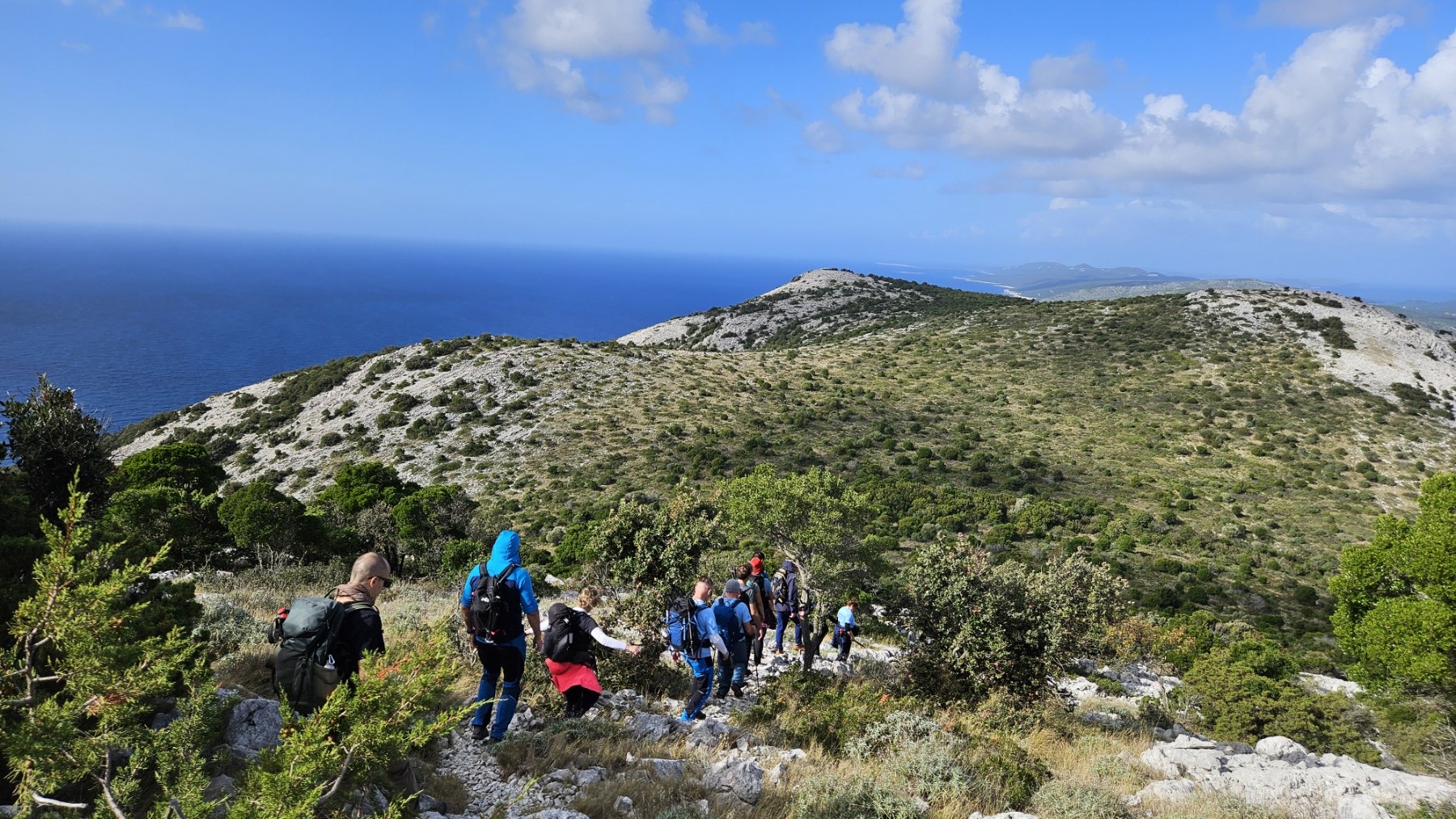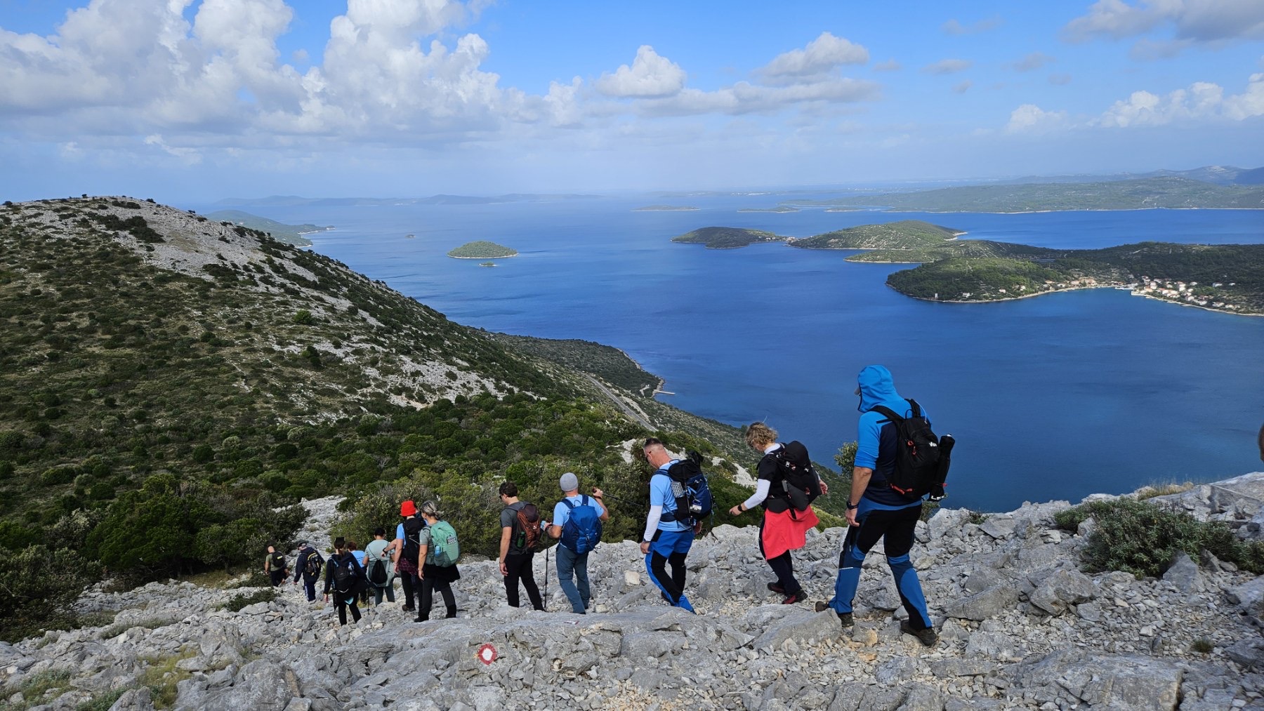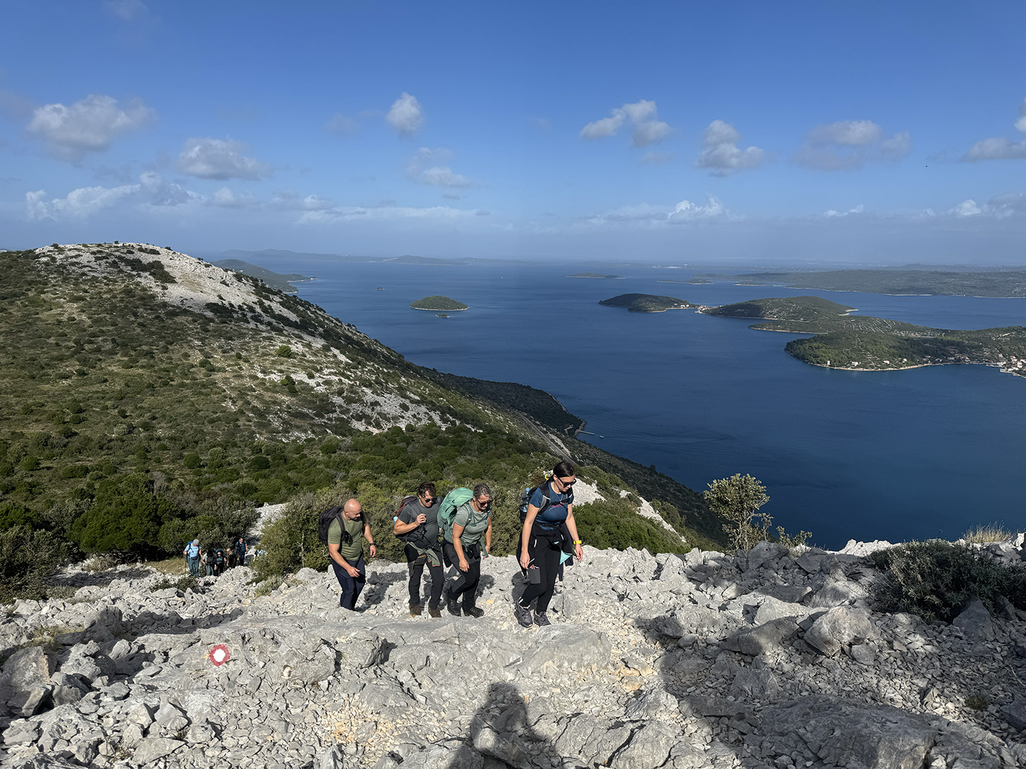 Prvi dan bio je posvećen Dugom otoku. Dolaskom u Zadar, uslijedio je prijevoz trajektom i iskrcaj u Brbinju. Ekipa se bacila na uspon na vrh Orljak. Kretalo se od nekadašnjeg kamenoloma, uslijedio je uspon po kozjoj stazi, a bilo je tu malo penjanja, malo hodanja po ravnici, malo “upadanja u depresiju” (ali samo topografsku, naravno!), da bi na kraju oštrim, kamenitim usponom izbili na vrh. No, trud se isplatio: na vrhu su uslijedili zasluženi odmori i pogledi koji liječe bol u mišićima.