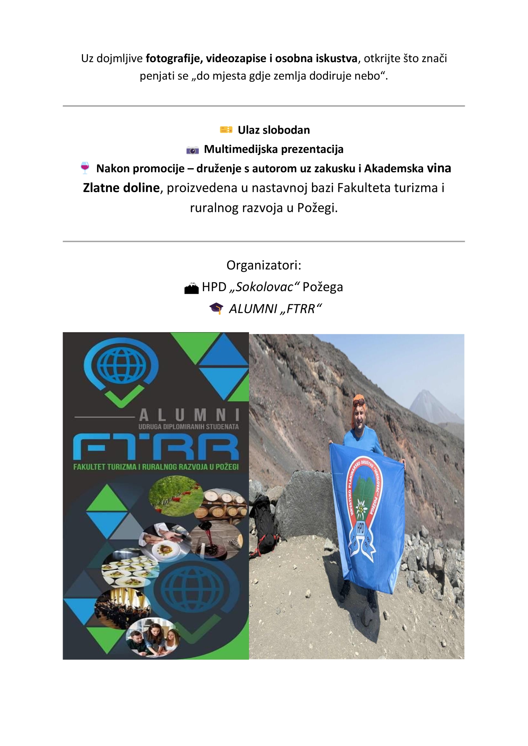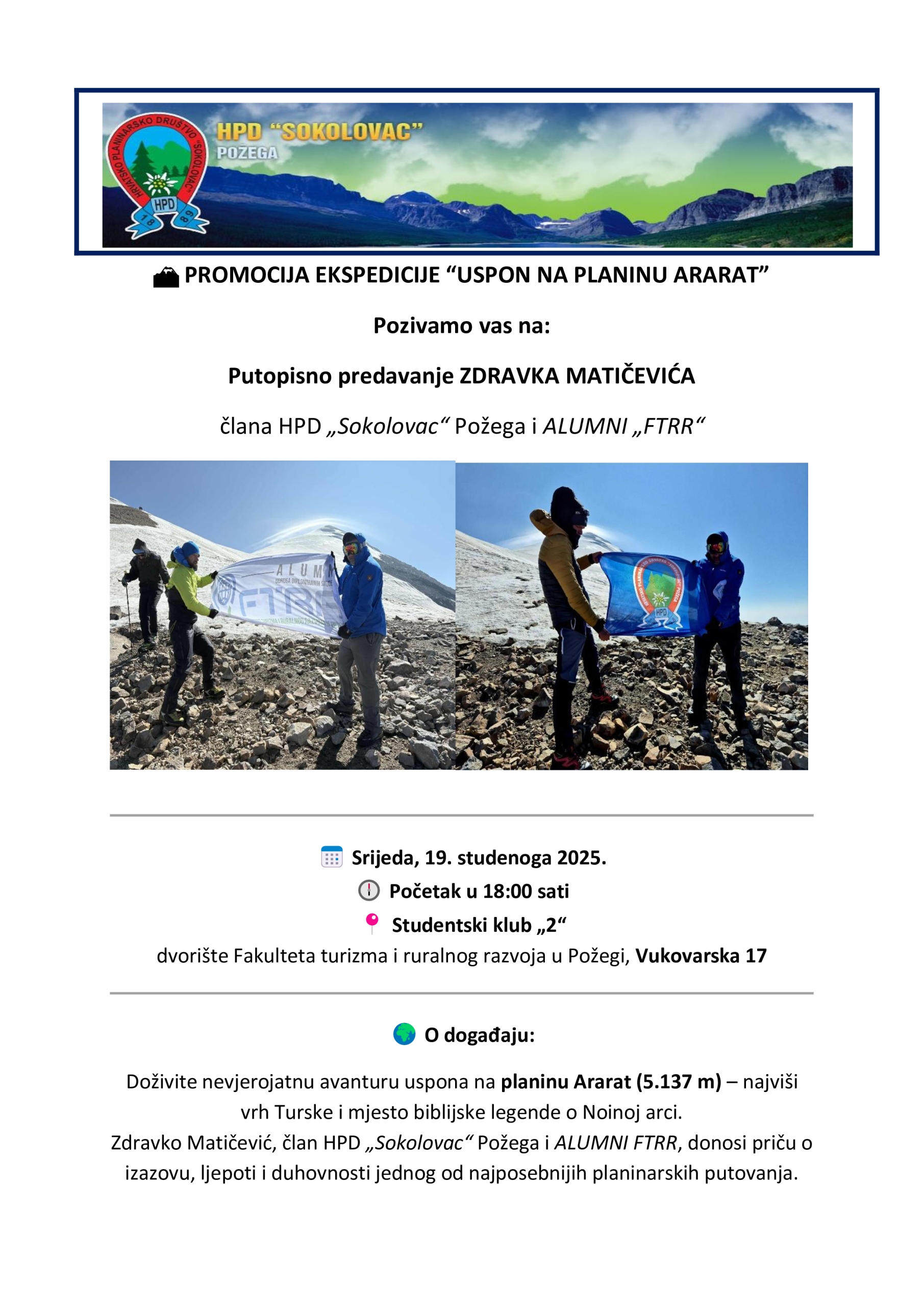 – “Kroz dojmljive fotografije, videozapise i osobna iskustva, Zdravko će publici približiti izazove uspona, ljepotu turskih planina i duhovni doživljaj susreta s Araratom – planinom koja spaja povijest, vjeru i avanturu. Nakon predavanja slijedi druženje s autorom uz zakusku i Akademska vina Zlatne doline, proizvedena u nastavnoj bazi Fakulteta turizma i ruralnog razvoja u Požegi. Ulaz je slobodan, a dobrodošli su svi ljubitelji putovanja, prirode i dobre priče!” – poruka je predsjednika HPD Sokolovac Brune Horvata.