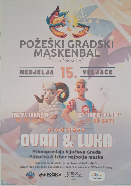 Od 17,00 sati u velikoj dvorani održat će se Požeški gradski maskenbal u sklopu kojeg će biti izvedena i predstava za djecu “Ovan & Luka”.