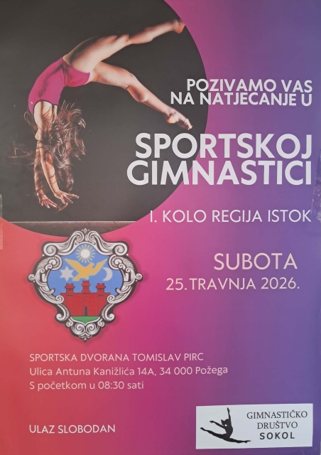 POŽEGA – U Sportskoj dvorani Tomislav Pirc, u subotu, 25. travnja 2026. od 8,30 do 17,00 sati održat će se 1. kolo regije Istok u sportskoj gimnastici u organizaciji Gimnastičkog društva “Sokol” Požega.